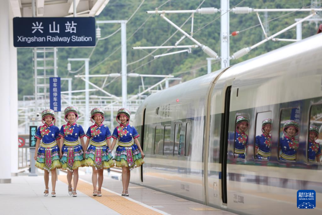 2022年6月20日,郑渝高铁实现全线贯通运营。这是在郑渝高铁兴山站,身着表演服的列车乘务员准备乘车为乘客表演节目。