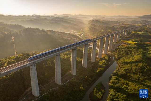 2023年8月31日,一列动车组在晨曦中经过位于贵州省独山县郊外的贵南高铁银坡河特大桥(无人机照片)。