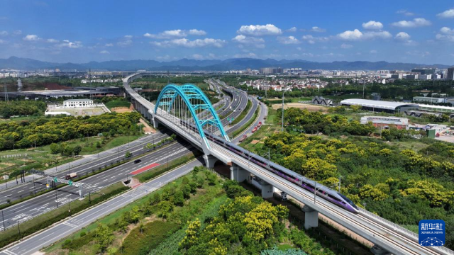 2024年9月6日,杭温高铁正式开通运营。这是列车行驶在杭温高铁浙江省义乌市境内(无人机照片)。