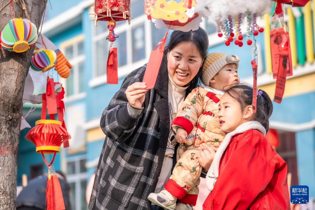 12月30日,在河南省驻马店市西平县一所幼儿园的元旦亲子游园庙会上,小朋友和家人一同参与猜灯谜游戏。