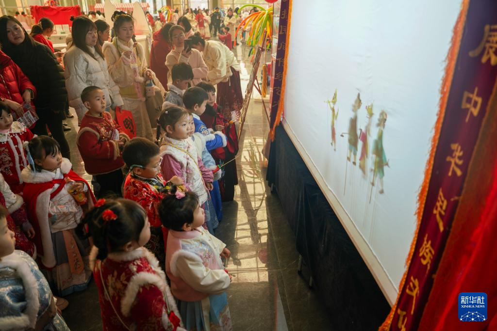 12月30日,四川省眉山市彭山区学院路幼儿园小朋友在区文化馆新春非遗市集活动上观看非遗皮影戏。