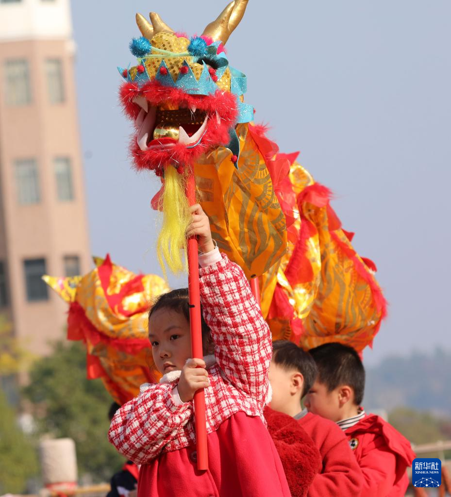 12月30日,江西省吉安市泰和县浅水湾幼儿园小朋友在表演舞龙。