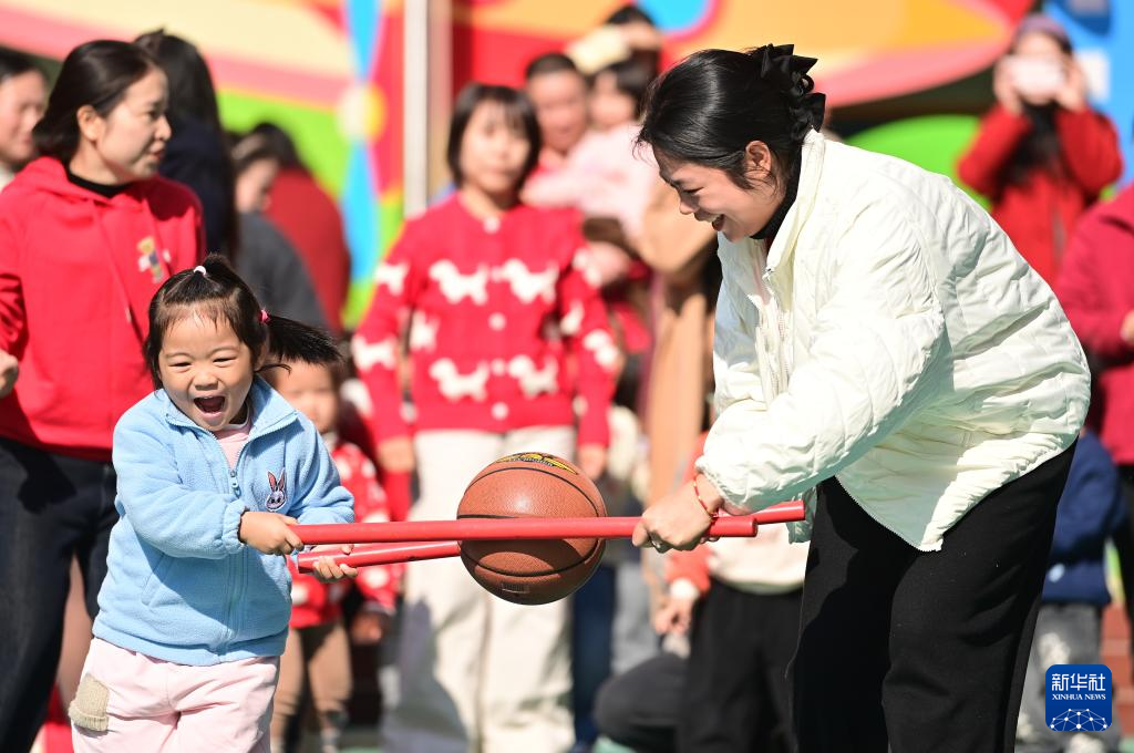 12月30日,在江西省赣州市章贡区第十五保育院,小朋友和家长在玩“合力运福球”趣味游戏。