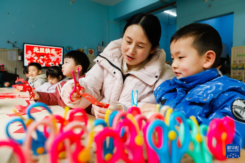 12月30日,在河南省武陟县第一幼儿园,老师和小朋友制作新年剪纸。