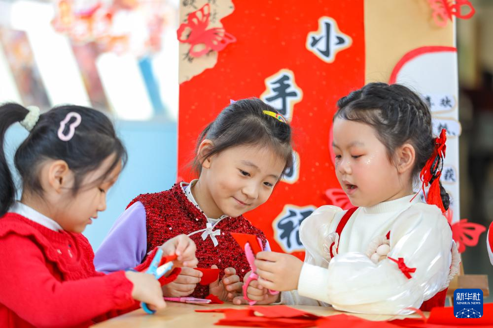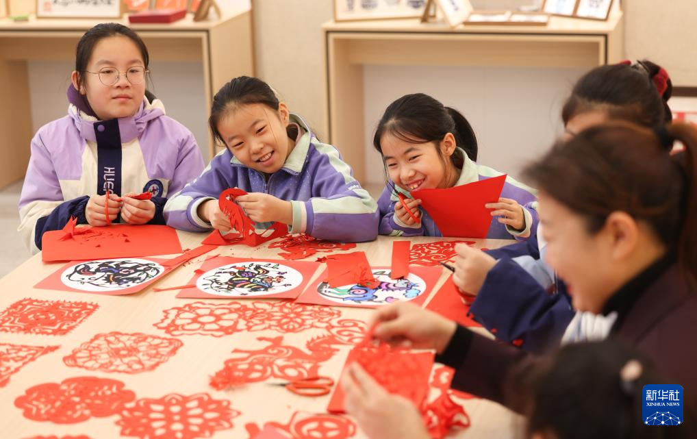 12月30日,河北省石家庄市天苑小学学生在非遗剪纸课堂上学习剪纸技艺。
