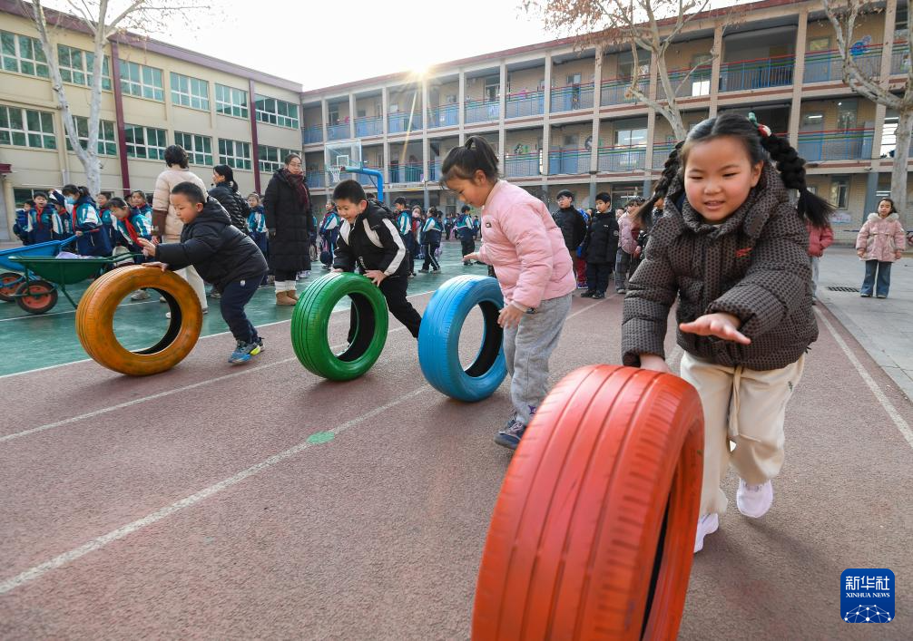 12月30日,在河北省石家庄市西里小学,学生进行滚轮胎比赛迎新年。