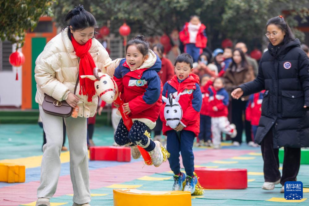 12月30日,学生在湖北省襄阳市樊城区第五幼儿园开展的迎新年亲子活动中进行趣味游戏。