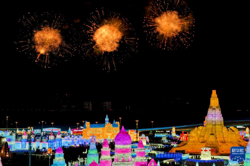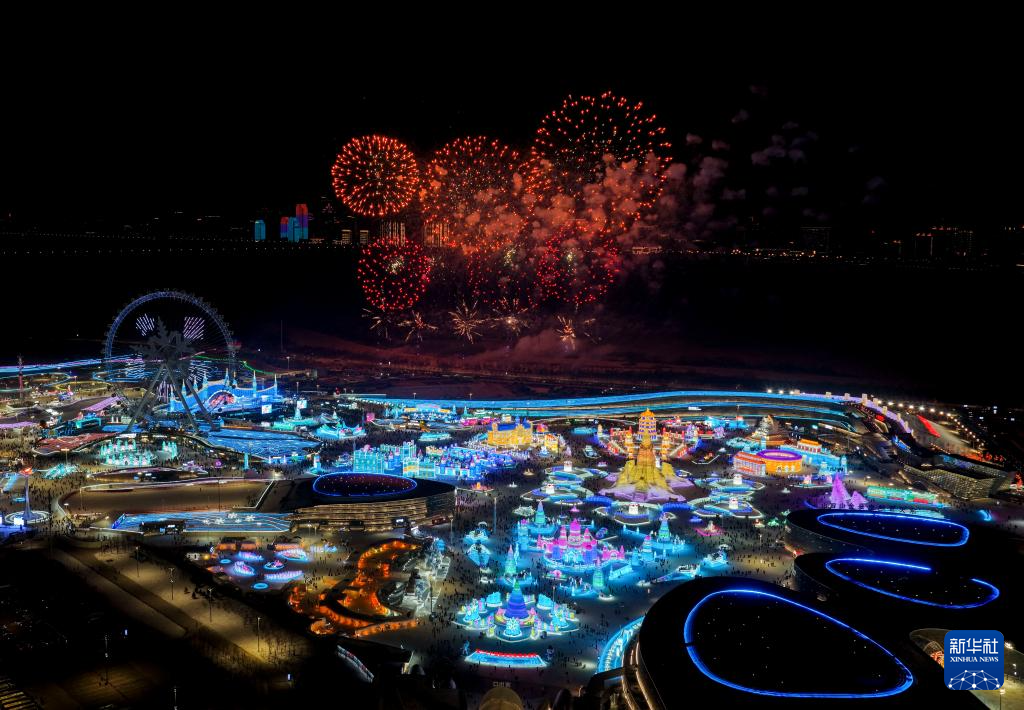 这是1月5日拍摄的哈尔滨冰雪大世界烟花秀(无人机照片)。
