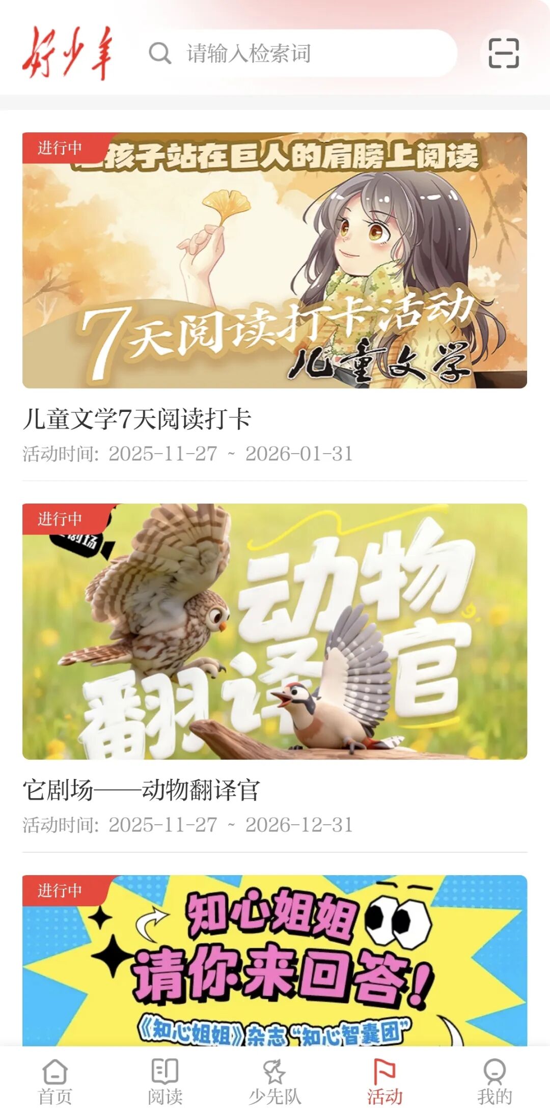 阅读服务是“好少年”APP的核心特色板块。精选中少总社数字报刊、重点图书及有声读物等优质资源,用户可便捷阅读《中国少年报》《我们爱科学》《儿童文学》等数字报刊;成长书单按年级与主题对精品数字图书分类,打造家长引导孩子开展阶梯性阅读的专属空间,提供优质资源与专业指导。有声书房板块汇集《林汉达历史故事》《猫武士》等超高人气IP内容,涵盖古诗文诵读、儿童文学、科普百科等系列有声书,总时长达上万分钟,助力少年儿童通过听觉输入积累知识、提升综合素养。