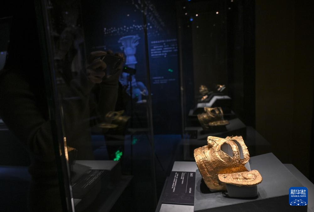 这是展出的戴金面罩青铜人头像(1月18日摄)。