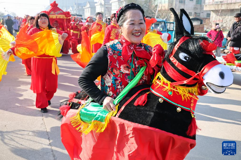2月2日,在江苏省连云港市赣榆区墩尚镇,人们进行民俗“踩街”表演。