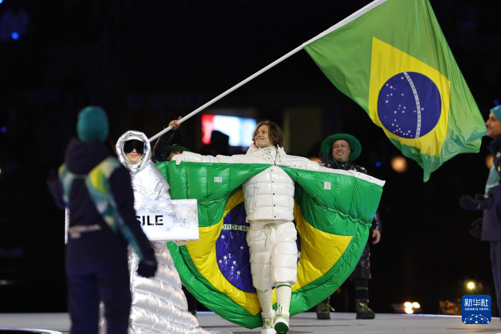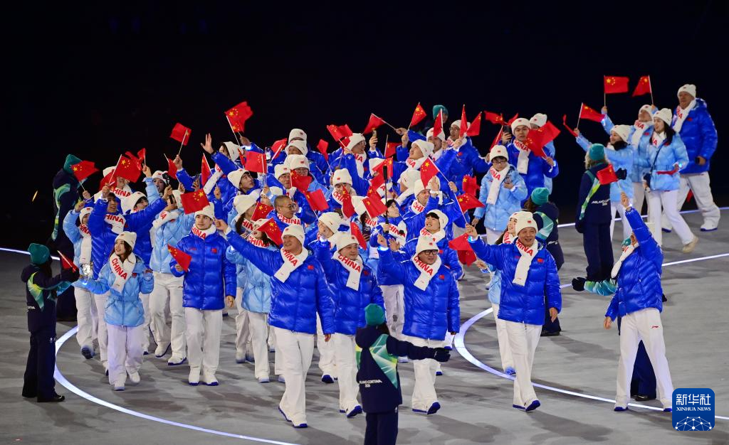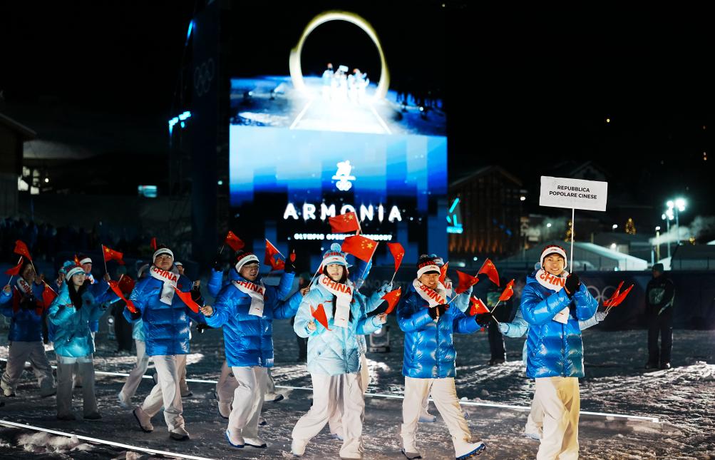 2月6日,中国体育代表团在普雷达佐跳台滑雪中心入场。