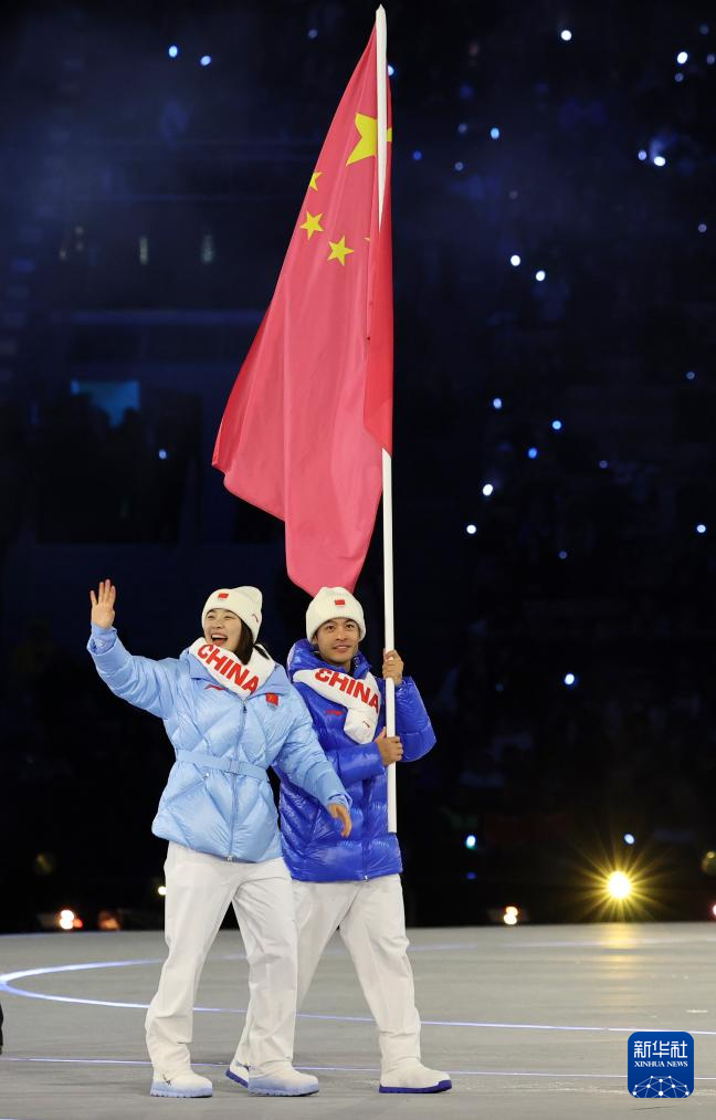 2月6日,中国体育代表团旗手宁忠岩(下右)、张楚桐(下左)在开幕式上入场。