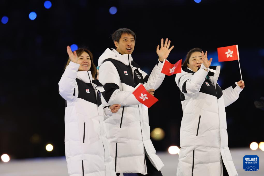 2月6日,中国体育代表团旗手宁忠岩(左三)、张楚桐(左二)在开幕式上入场。