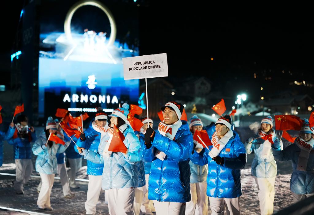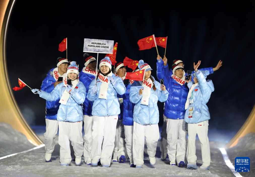 2月6日,中国体育代表团成员在意大利普雷达佐参加入场仪式。