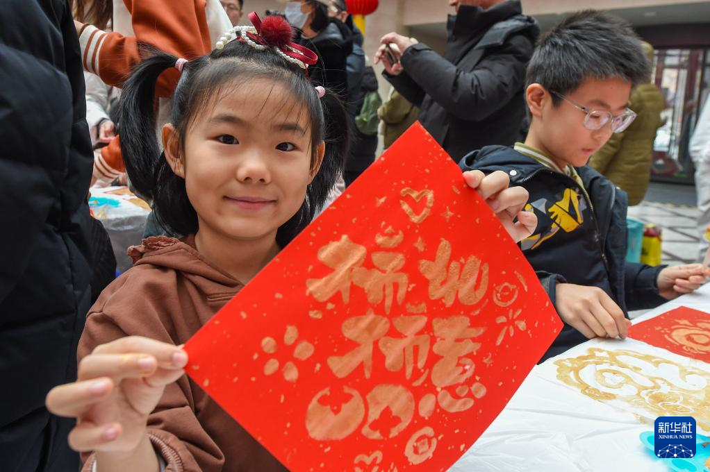 2月10日,在长春市图书馆,小朋友展示创意福字。