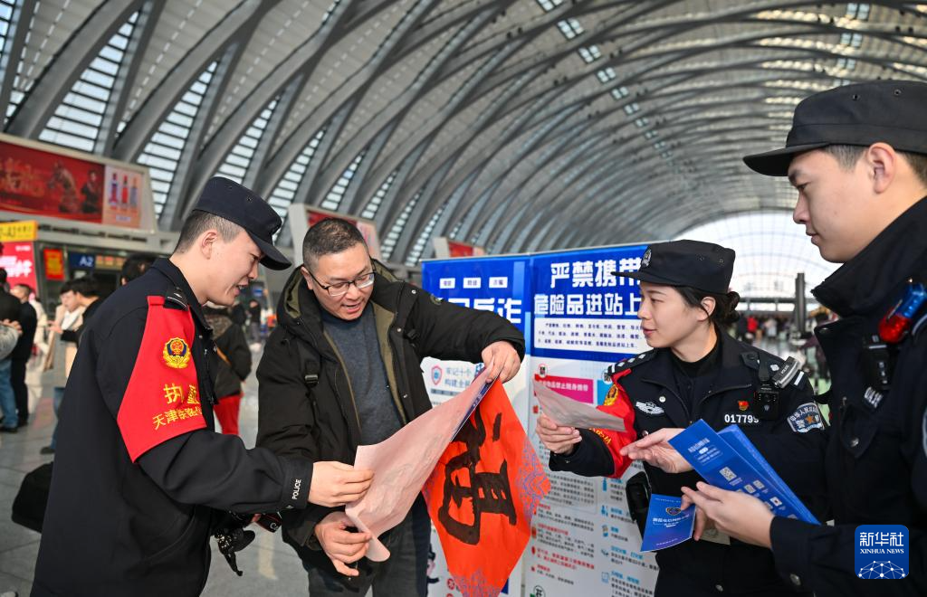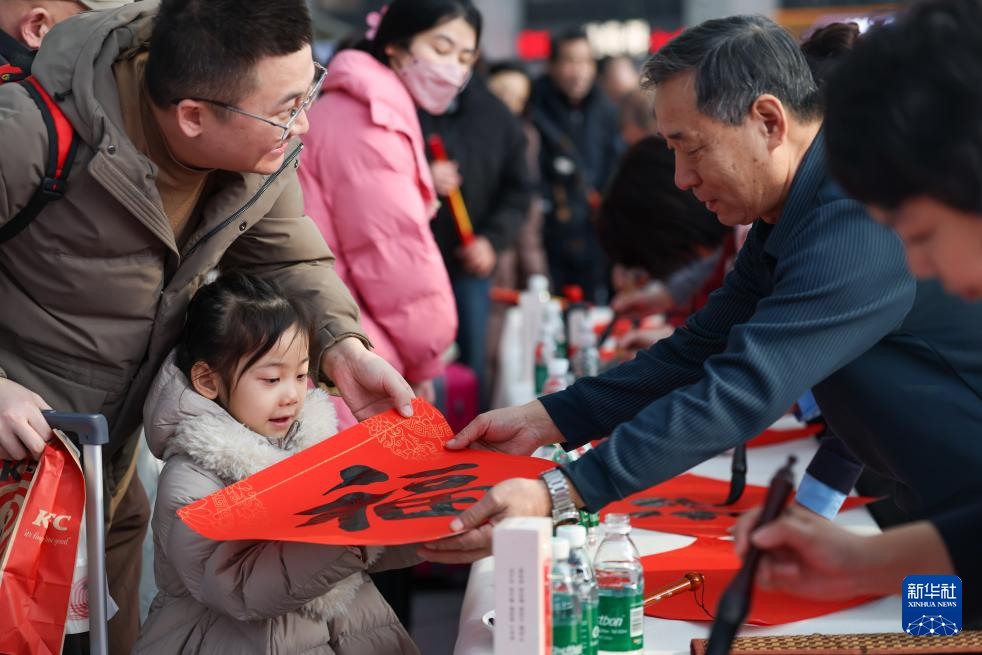 2月10日,在天津西站候车厅,天津铁路公安处天津西站派出所民警为旅客送“福”字。