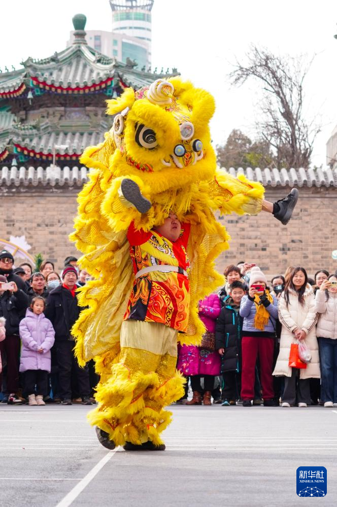 2月10日,民俗表演爱好者在济南上新街表演舞狮。