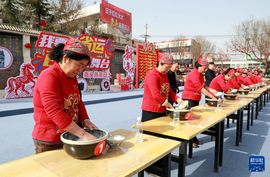 2月10日,人们在陕西省渭南市澄城县百姓大舞台文化活动上参加和面比赛。