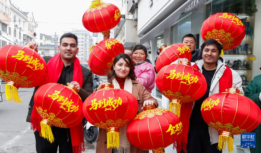 2月10日,在江苏省淮安市淮阴区营中社区,淮阴师范学院留学生和社区居民一起挂灯笼。