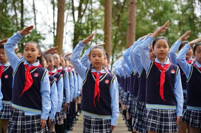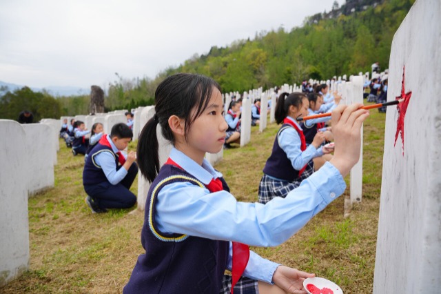 清明节来临之际,四川省巴中市通江县实验小学组织师生走进全国最大红军烈士陵园——川陕革命根据地红军烈士陵园开展“清明祭英烈 薪火永相传”主题祭扫活动。活动中,孩子们通过各种形式来缅怀革命先烈,传承红色基因。(中国教育报-中国教育新闻网 通讯员 程聪 摄)