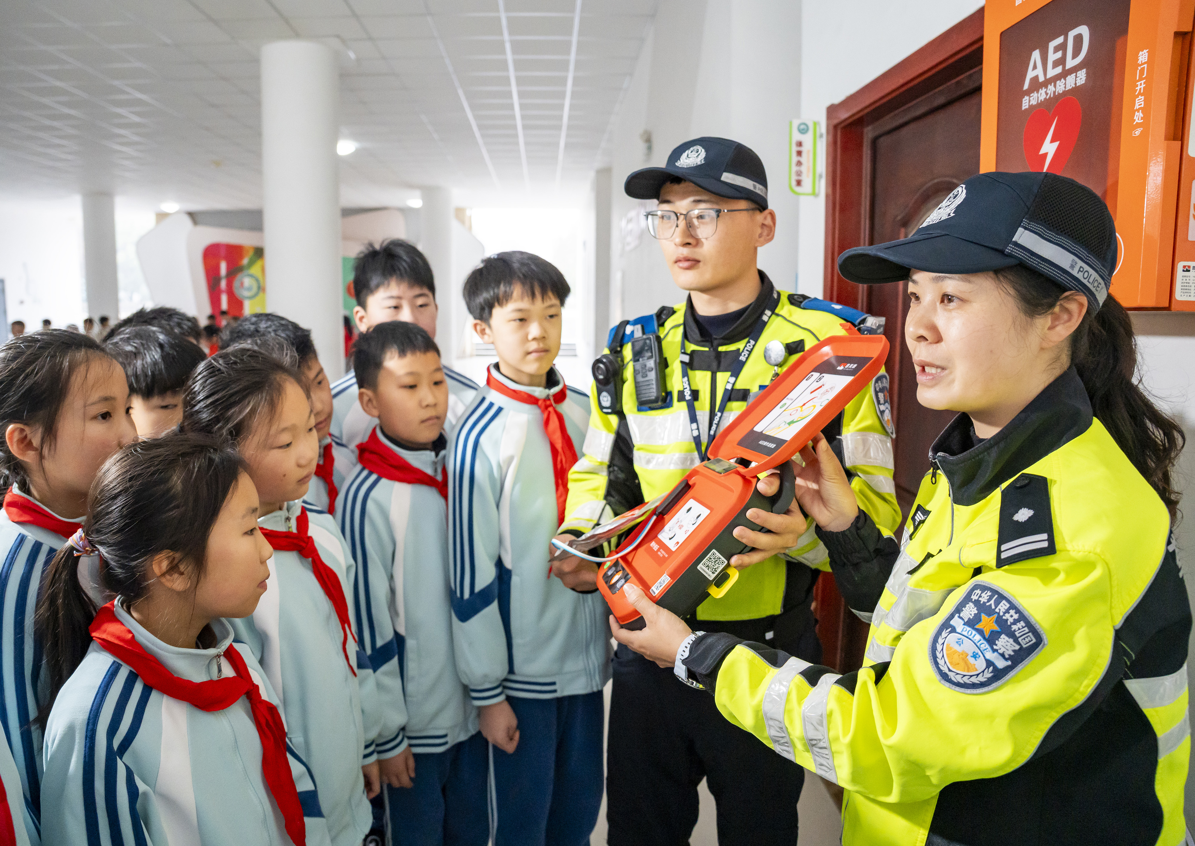 在江苏省南通市通州区南山湖小学,交警为小学生讲授AED急救知识。