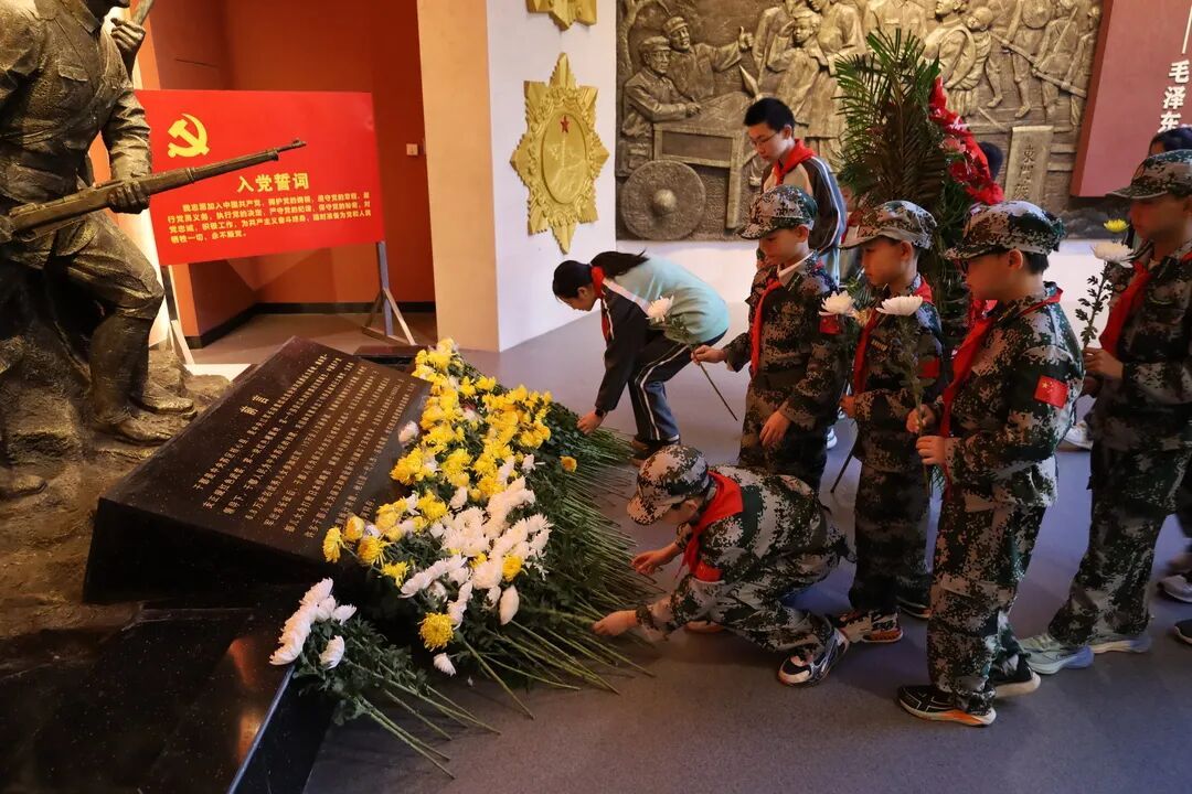 缅怀仪式庄重肃穆,全体人员整齐肃立,向革命先烈和英雄模范默哀并三鞠躬。少先队员代表敬献花篮,表达最深切的追思。“红领巾讲解员”深情诵读原221基地老职工家书,字里行间质朴而炽热的家国情怀,感人至深催人奋进。队员们纷纷抒发崇敬之情,立下“立志成才、报效祖国”的誓言。