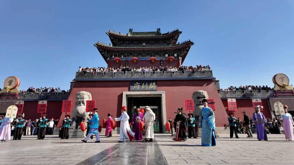 开封府景区的实景演出,生动还原包拯偕属官、衙役执燧取火,向百姓、各国使节颁新火的场景,寓意除旧布新、开启新程。