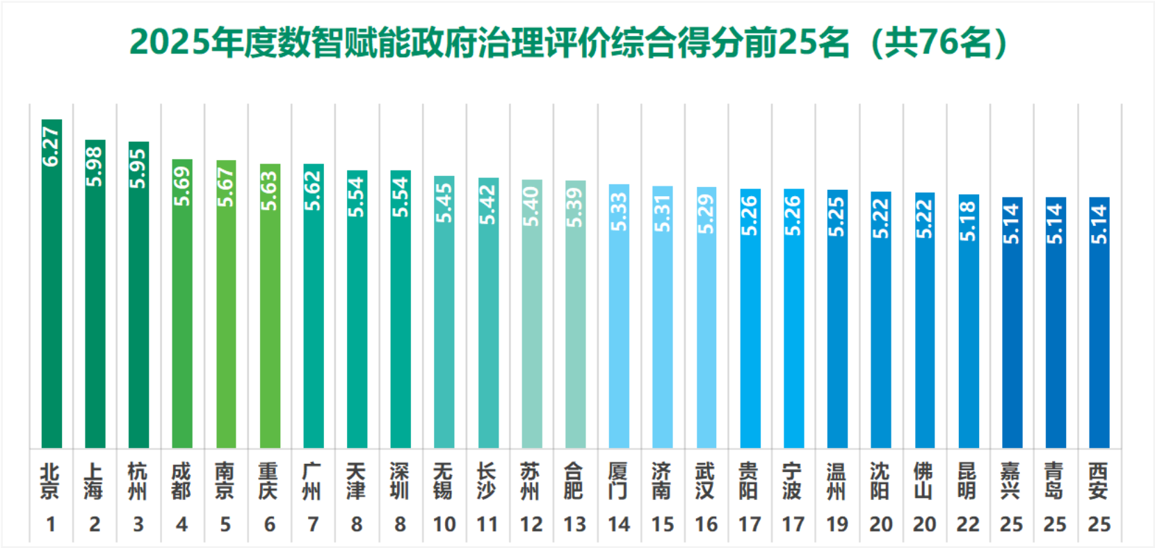 “数智赋能公共服务”一级指标用于评估政府利用数智技术提升行政效能、赋能行业发展、促进数智经济、增进就业的能力。评价结果显示,北京在该指标上遥遥领先,上海、杭州、深圳表现出色,南京、广州、杭州、重庆、成都表现良好。