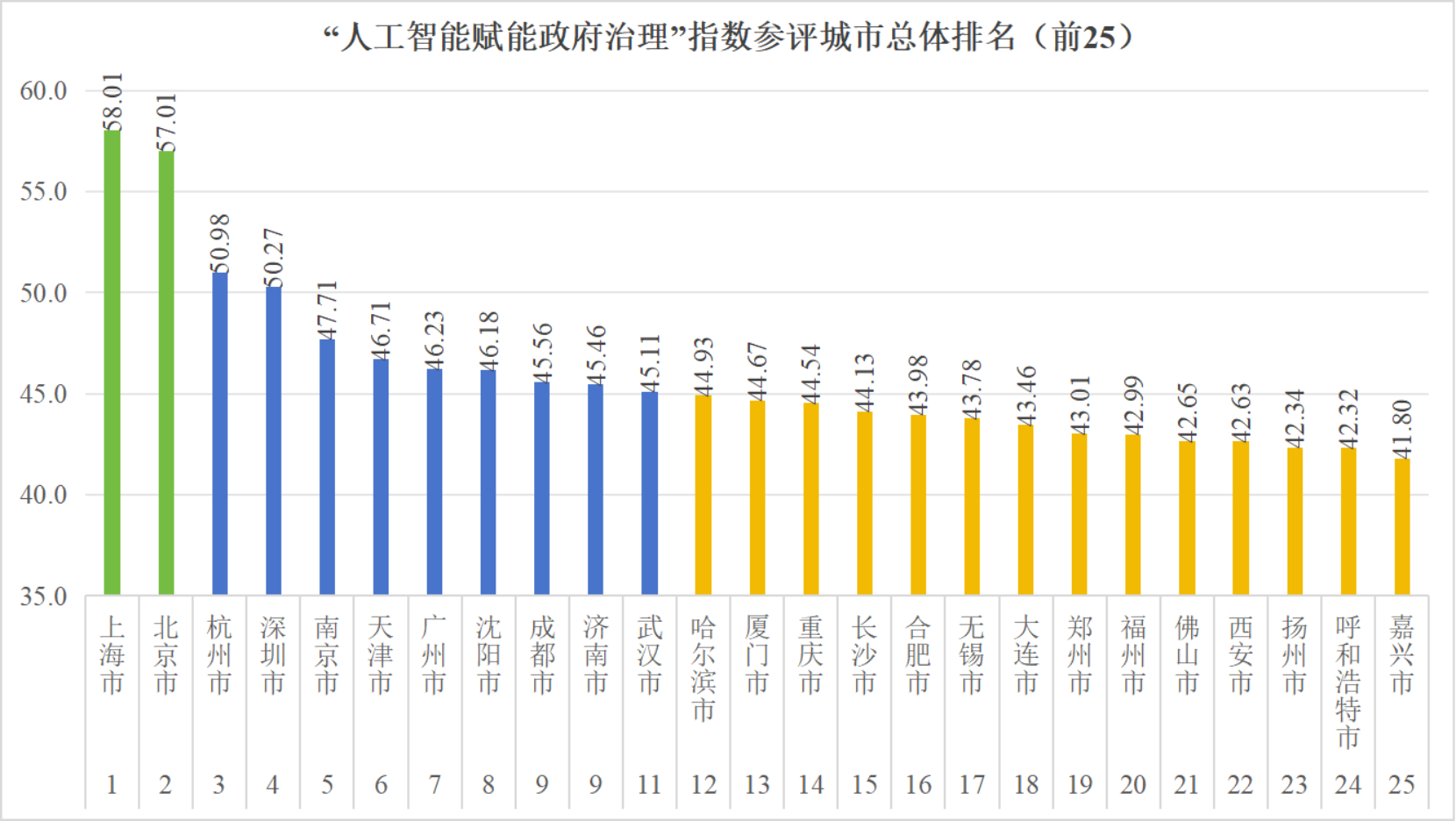 此外,本次会议还单独发布了“AI赋能政府治理评价指数”报告,其指标包括人工智能政策制定、算力基础设施建设、智能办公助手应用、智能巡检机制、免申即享机制建设、智慧应急体系建设、智慧交通、智慧文旅。报告显示,我国人工智能赋能政府治理呈现多极引领、各有所长的总体格局,上海、北京遥遥领先,杭州、深圳、南京走在前列,其它城市差距显著。