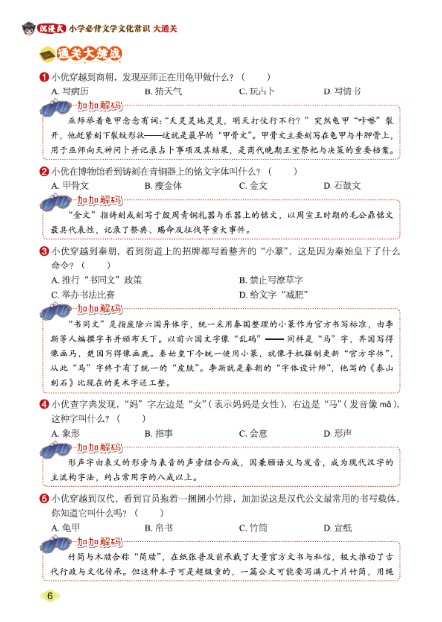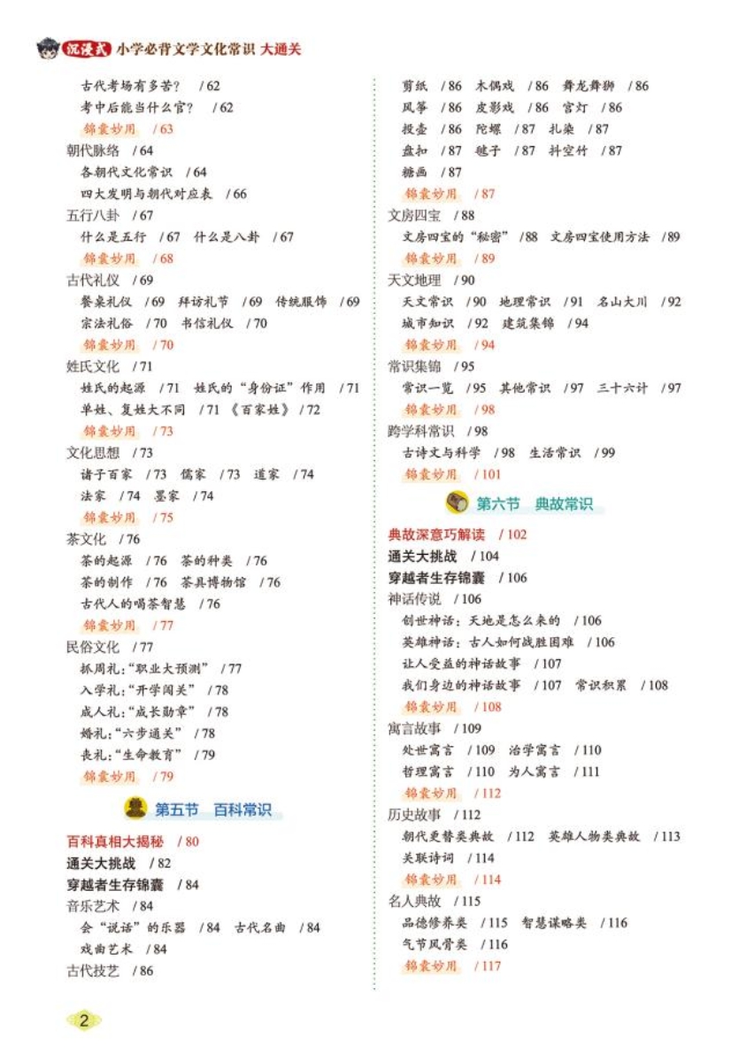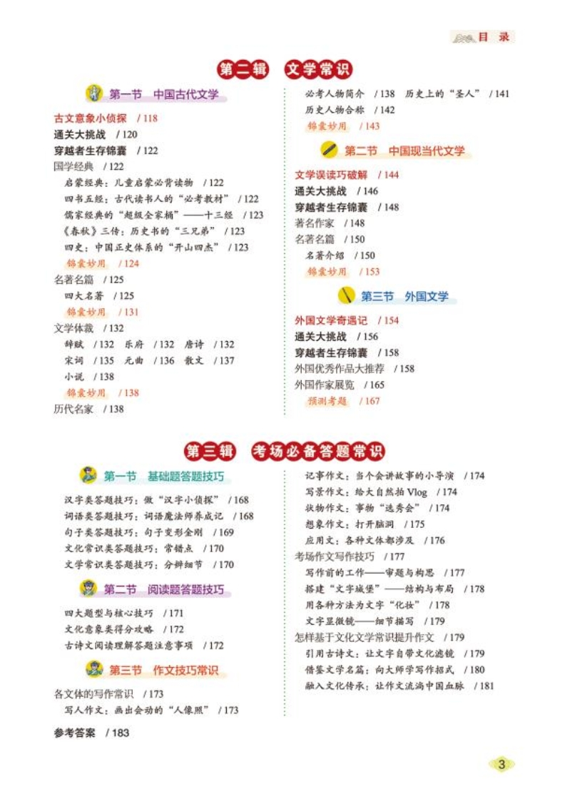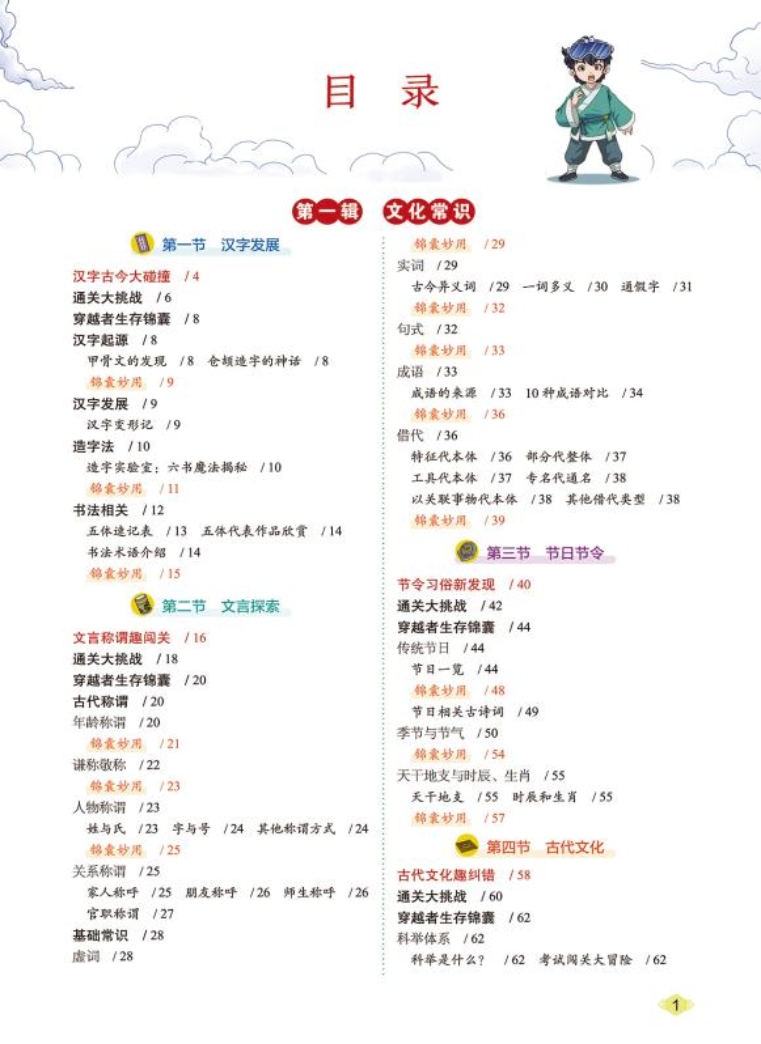 【解释说明】目录就是孩子的“闯关地图”。从“汉字发展”到“文言探索”,从“节日节令”到“考场技巧”,六大文化模块+三大文学体系,结构清晰,循序渐进,帮助孩子建立宏观认知框架。