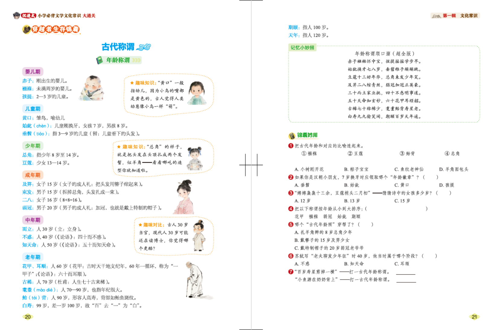 解释说明:学完“总角”“弱冠”“古稀”等年龄称谓,立刻通过排序、连线、找穿帮等趣味题目进行巩固,确保知识真正消化吸收。