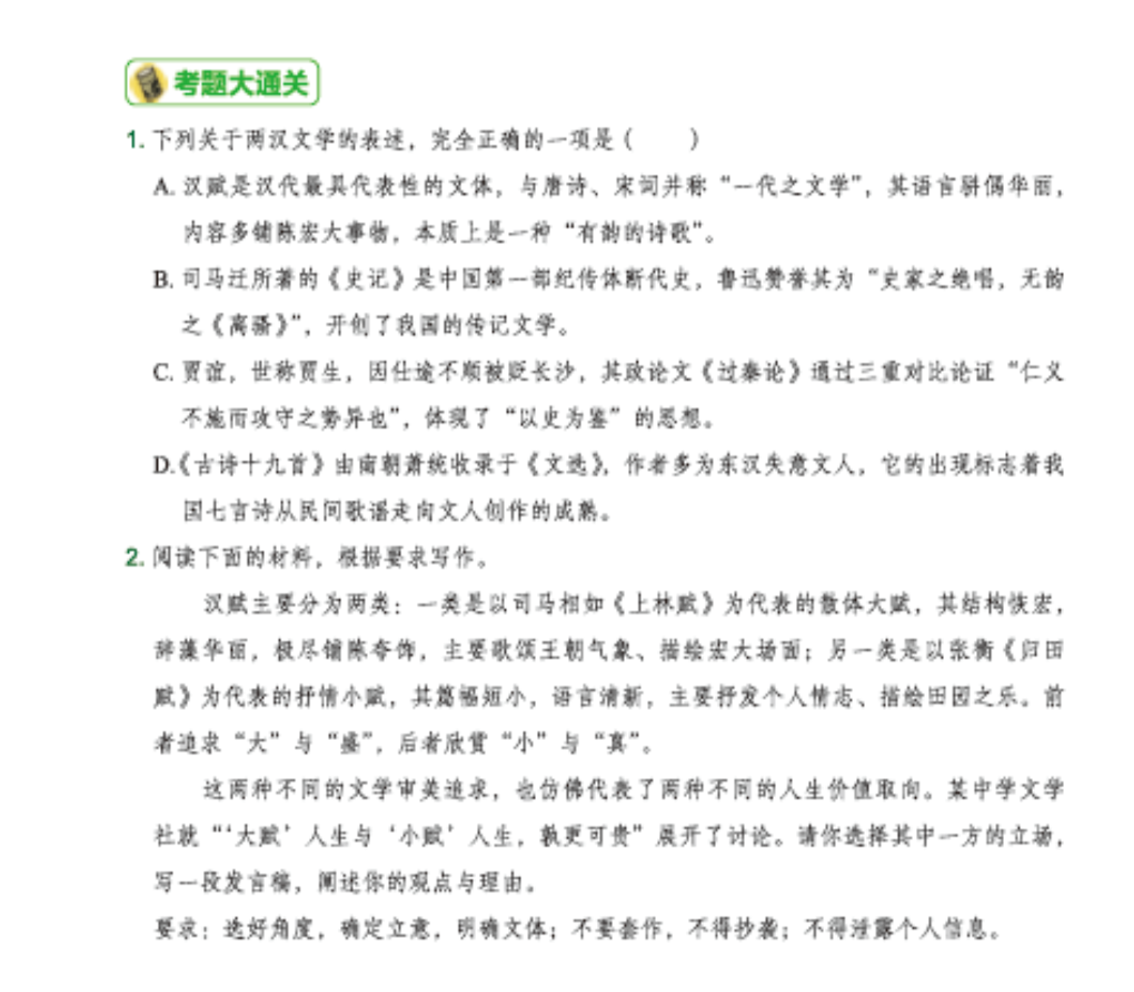 “考题大通关”模块,精选习题,严格按照高考题型、难度分层编排,实现“学完一章节、练习一章节”的闭环模式,让学生及时实战检验学习效果,快速掌握解题技巧,精准查漏补缺,最终实现常识板块稳提分、零丢分。