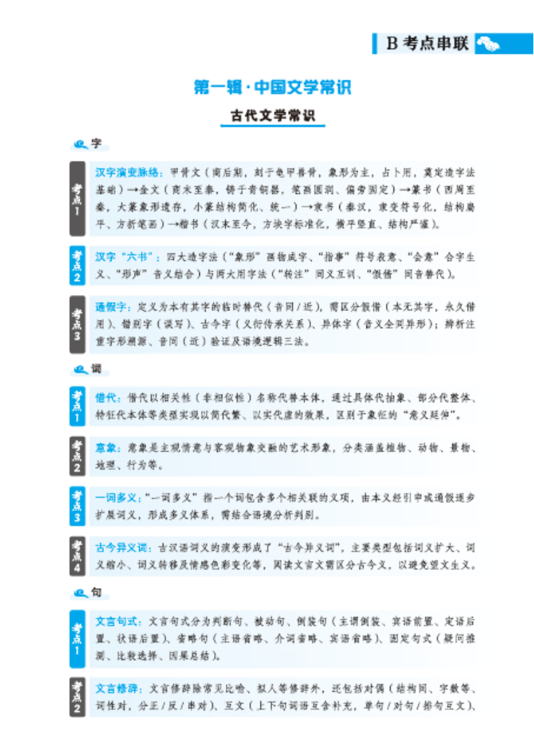 本书采用“沉浸式”解读模式,仅聚焦知识点本身,对每个核心知识点逐点拆解、细致剖析,知将抽象的文学文化常识变得具体、生动,打破“常识记忆枯燥、难背”的困境,让学生在理解知识点本身的基础上记忆,记得更牢、用得更活,避免死记硬背、记了就忘。