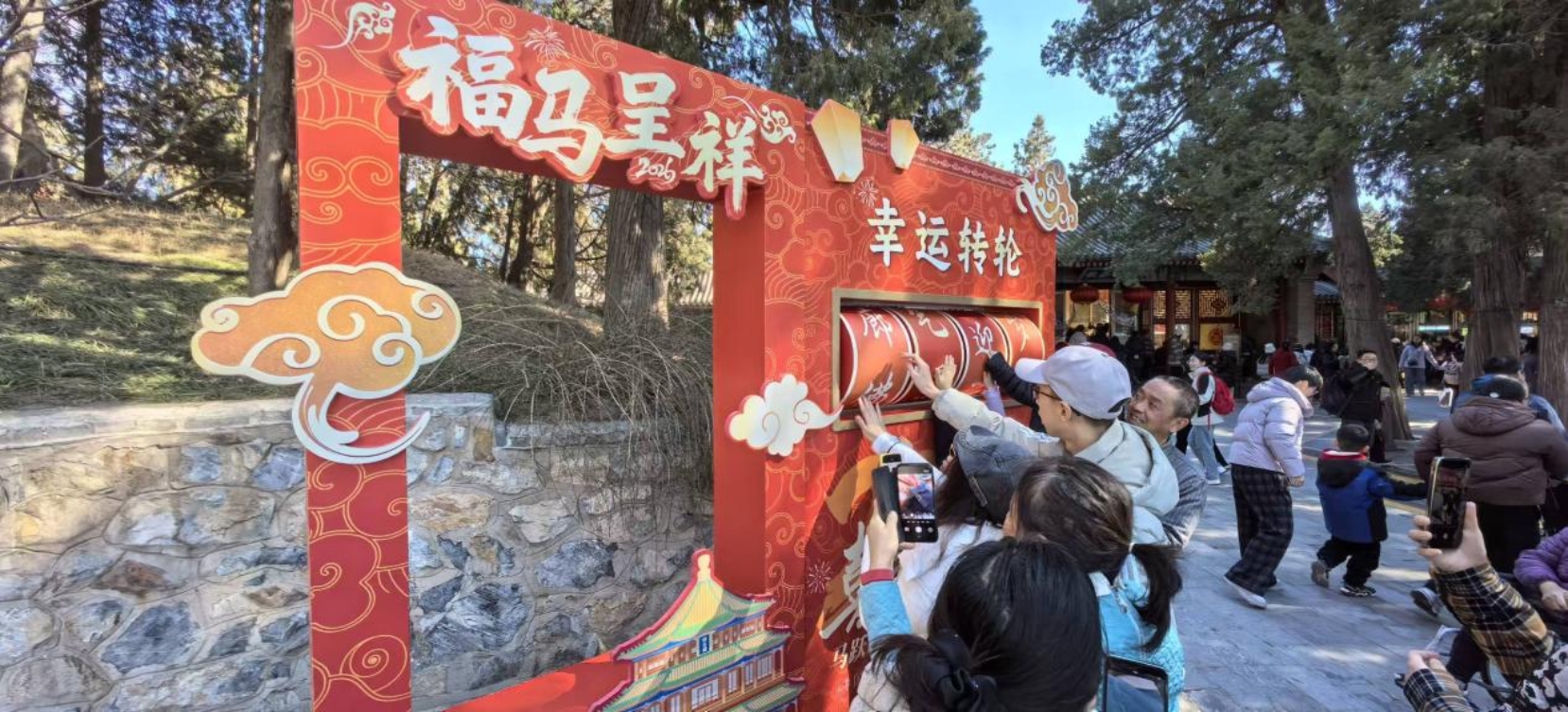 走出胡同,记者来到阔别数年的地坛春节文化庙会。这里张灯结彩,人声鼎沸。传统的风车“嘎嘎”作响,吹糖人的师傅巧手翻飞,一会儿就做出一匹奔腾的骏马。京味叫卖、戏曲杂耍、民间花会等表演吸引了里三层外三层的观众。在年货市集上,除了常见的春联、福字、中国结,印有骏马图案的各类文创产品、老字号“稻香村”的“马上封侯”点心匣子都成了抢手货。
