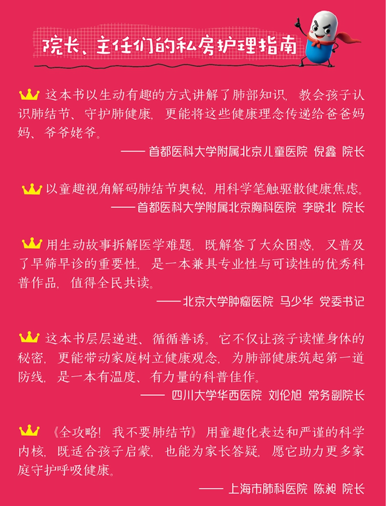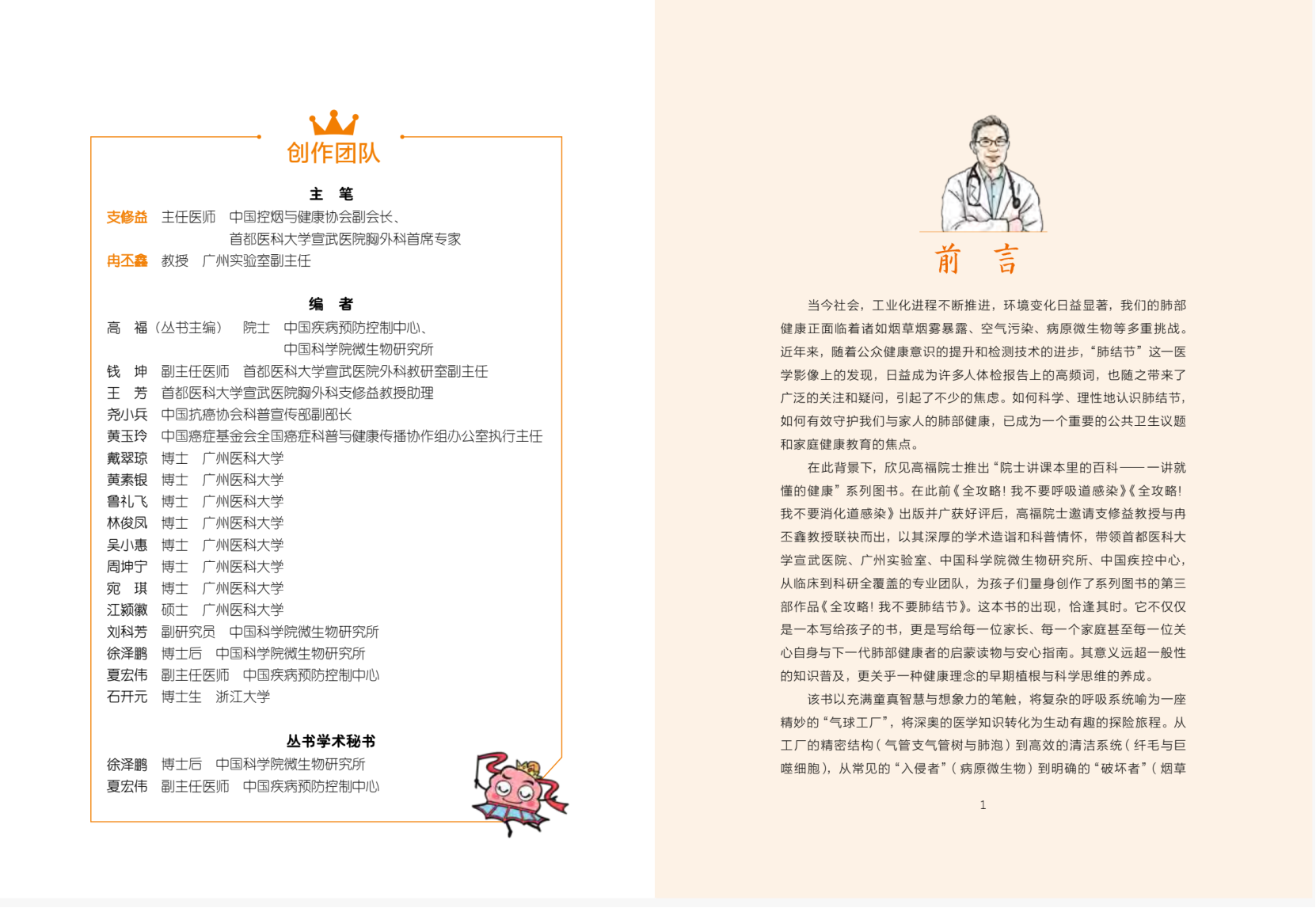 作为系列新作,《全攻略!我不要肺结节》由高福院士主编,支修益、冉丕鑫两位教授主笔,钟南山院士推荐,汇聚首都医科大学宣武医院、广州实验室、中国科学院微生物研究所、中国疾控中心等机构的专业团队共同编撰,内容全面,权威准确,全方位缓解家长肺结节焦虑。