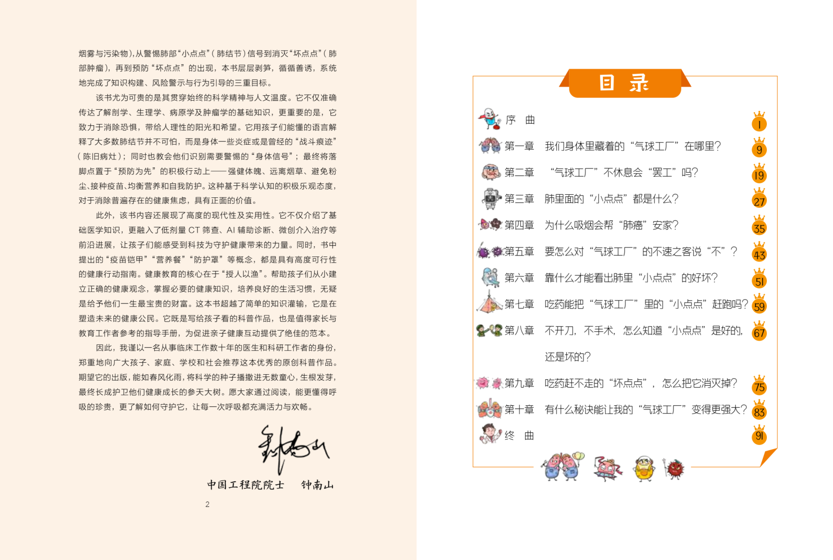 这本书面向6-12岁小学生,以10个常见的肺部健康相关问题导入。针对孩子,这本书贴合其认知规律,用通俗直白的语言、生动有趣的表达解读肺部知识,比如,肺里面的“小点点”都是什么?靠什么才能看出肺里的“小点点”的好坏?;针对家长,书中涵盖肺结节常见问题解析、随访指南、家庭护理建议等实用内容,帮助家长提升健康认知,更好地守护自身及孩子的肺部健康。比如,不开刀,不手术,怎么知道“小点点”是好的,还是坏的?有什么秘诀能让我的“气球工程”变得更强大?