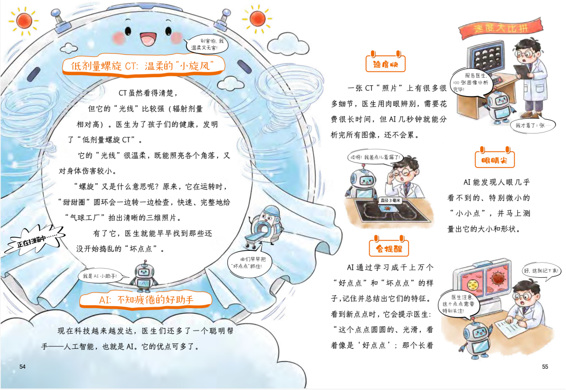 同时,《全攻略!我不要肺结节》打破传统科普的枯燥感,以“气球工厂”为喻,将复杂的呼吸系统转化为生动的探险旅程,用趣味故事和插图解释“为什么要拍CT”等,摒弃晦涩专业术语,既让孩子看得懂、喜欢读,也让家长能用上、用得好,真正实现了“学健康、懂健康、守健康”。