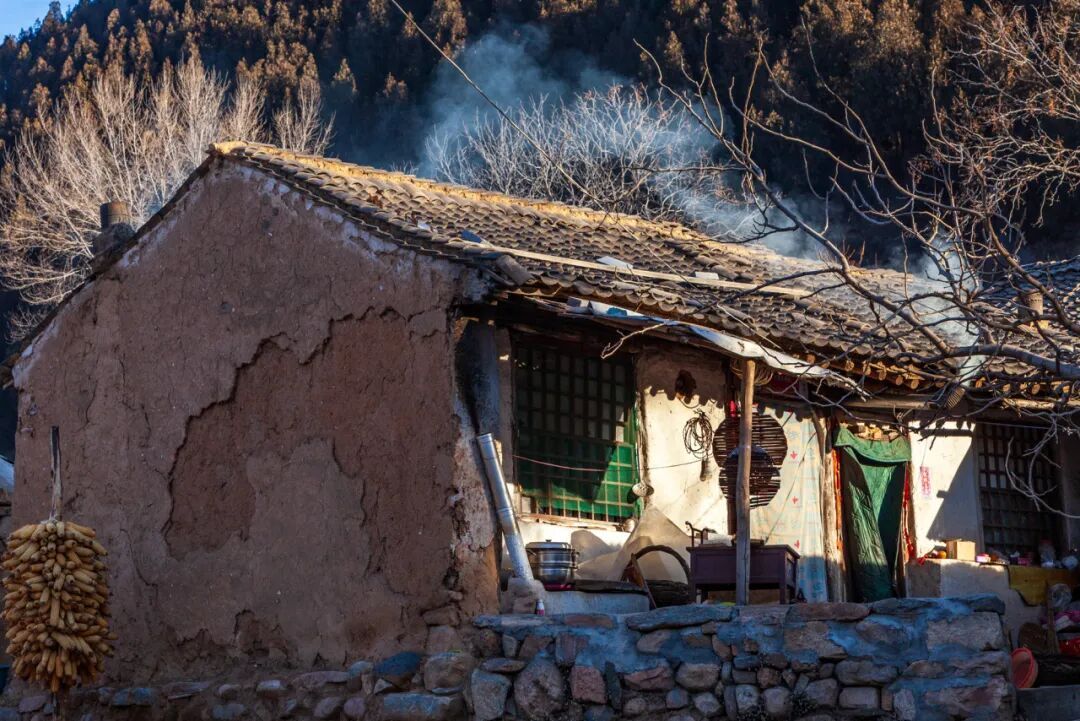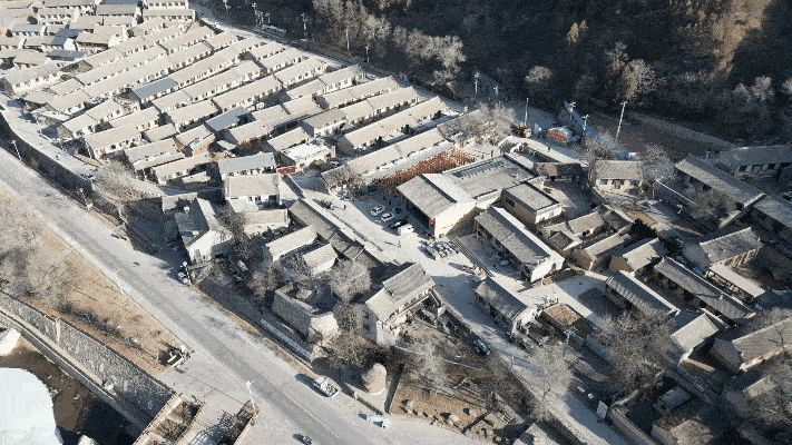他身后的河北阜平县骆驼湾村,一座座崭新民居依坡而建,青水瓦、木挑梁,红灯笼挂满了檐。