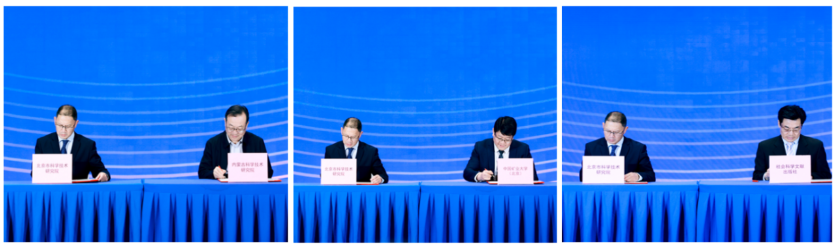 签约授牌环节,智库联盟迎来来自中国、巴基斯坦、南非、葡萄牙、意大利5个国家的13家新增理事单位,理事单位已覆盖19个国家和地区、102家智库机构。在国际与区域合作签约仪式上,北京市科学技术研究院(以下简称“北科院”)与内蒙古科学技术研究院、中国矿业大学(北京)、社会科学文献出版社分别签署战略合作协议;智库联盟与金砖创新基地(中俄)数字经济研究中心、北京国际技术交易联盟分别签署合作备忘录。在智库联盟创新中心授牌仪式上,智库联盟授牌成立德国国际创新中心、华南区域创新中心、数字经济创新中心(厦门)。北科院院长伍建民,内蒙古科学技术研究院党组成员、副院长宋志文,中国矿业大学(北京)党委书记韩尚峰,社会科学文献出版社党委书记、社长冀祥德,智库联盟秘书长李军凯,金砖创新基地(中俄)数字经济研究中心副主任沙明,北京国际技术交易联盟理事长张璋,史太白欧洲综合风险管理学会首席执行官亚历山大·约万诺维奇(Aleksandar JOVANOVI),深圳公共管理教育培训学院院长付冠达等代表出席签约授牌仪式。
