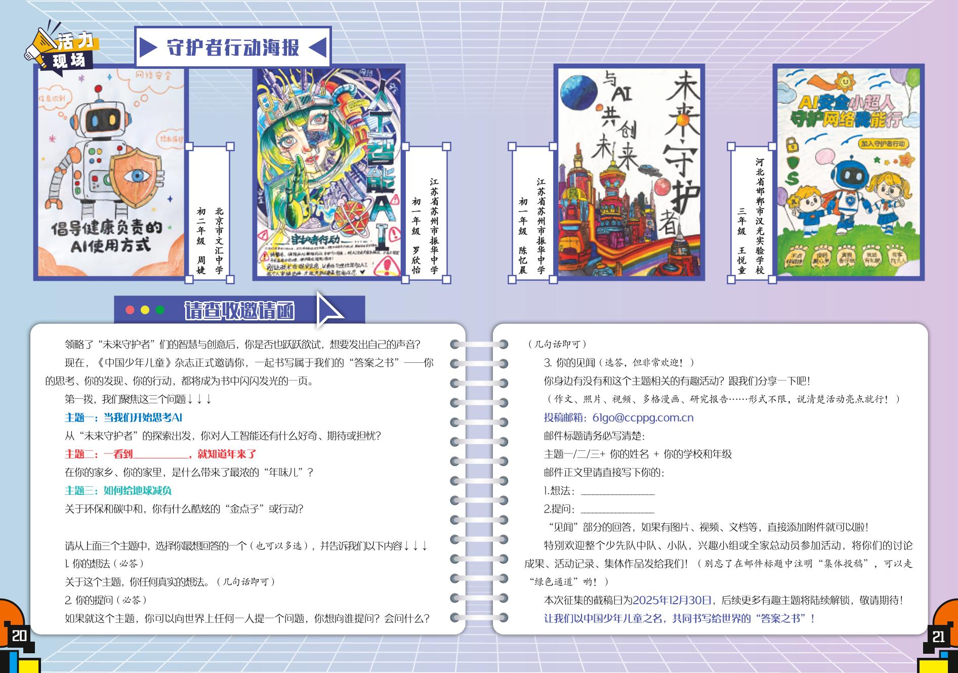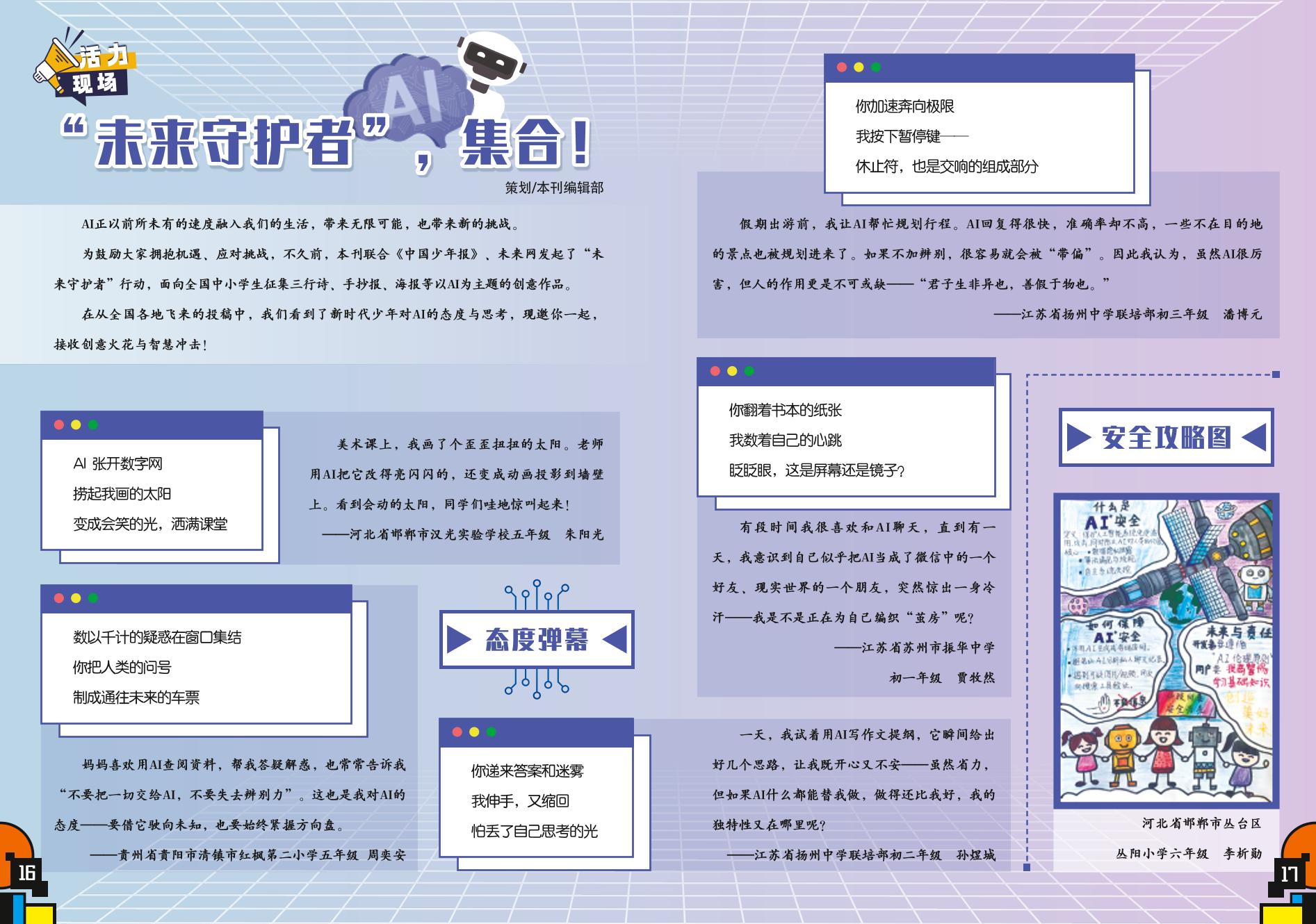 为提升AI时代青少年网络素养,《中国少年儿童》编辑部策划了未来守护者系列作品。以“创作征集+线上互动游戏”为核心,面向全国中小学生征集三行诗、手抄报、海报等原创作品,并通过H5游戏(5大密室、30个关卡)引导青少年沉浸式学习网络安全知识。覆盖超2000人次,征集作品数百件,优秀成果在线上专题页集中展示,并回馈至杂志专栏刊登,成功将读者从“内容消费者”转变为“内容共创者”,形成了“价值引领-技术赋能-读者共创”的闭环。