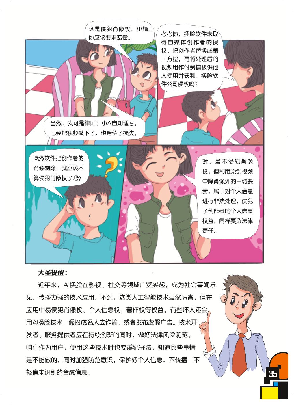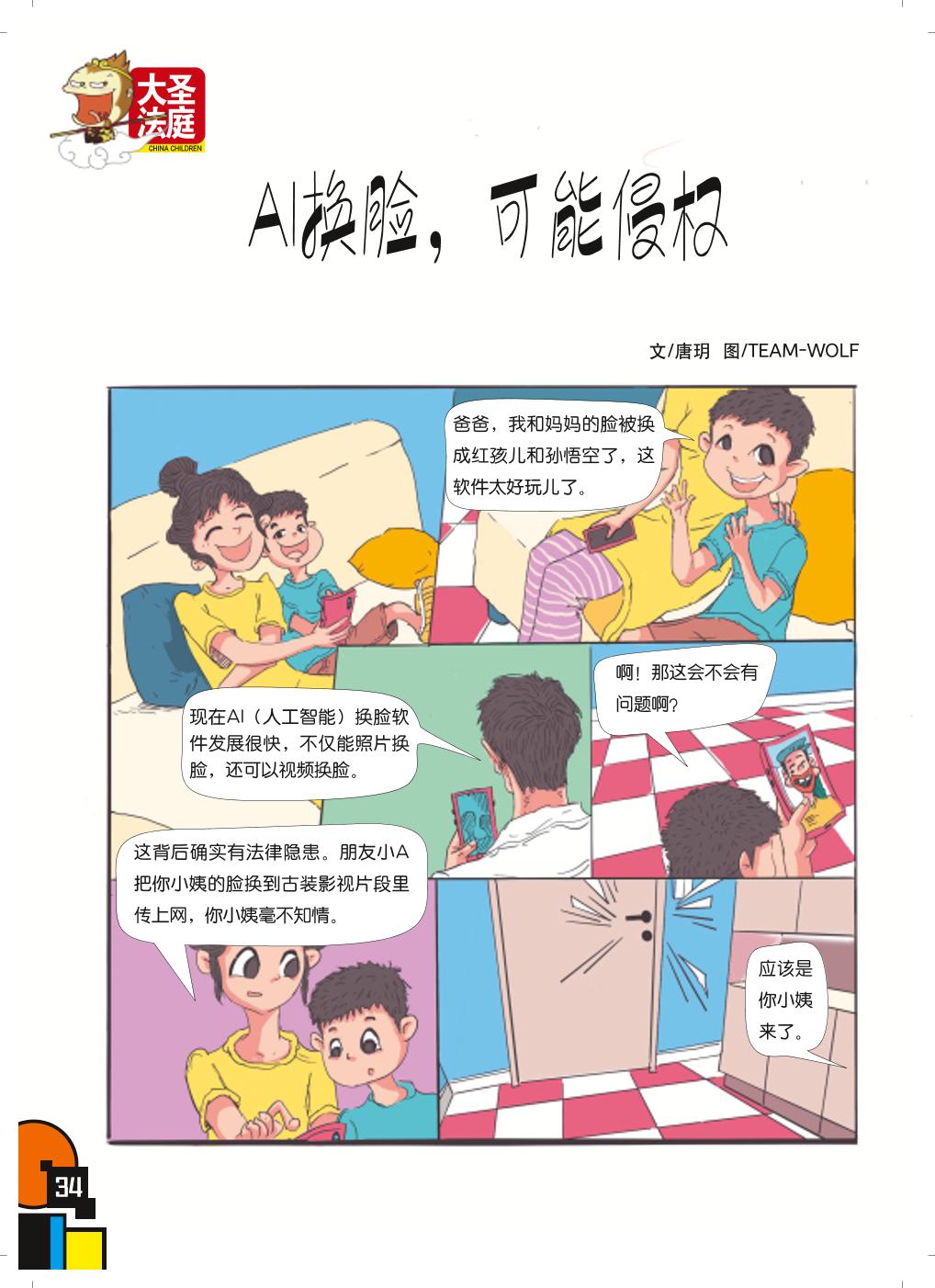《大圣法庭》栏目以漫画故事为载体,深入剖析社会热点问题,并通过“大圣”这一虚拟形象呈现解决方式,促进实际问题的解决。 不知不觉间,“AI换脸”这种看似神奇有趣的科技玩法逐渐在大众中流行起来,其中不乏未成年人,但其背后隐藏的侵犯肖像权、隐私泄露、网络欺诈、信息真假难辨等问题也逐渐凸显,给未成年人带来了诸多潜在风险。据调查显示,不少未成年人热衷于体验AI换脸应用,其中部分学生因缺乏辨别能力,容易被不良信息诱导甚至卷入虚假信息的漩涡。这一现象折射出未成年人网络保护工作中的新挑战,亟需引起社会各界的高度重视。 为应对这一现象,《大圣法庭》专栏通过校园漫画展示“AI换脸”滥用对人们的危害,并邀请法律专家对与之有关的问题进行权威解答,编辑再将其转化成少年儿童听得懂、记得住的表达形式,以漫画搭配权威解读的方式,对小读者进行普法教育。 | ||||||||||||||