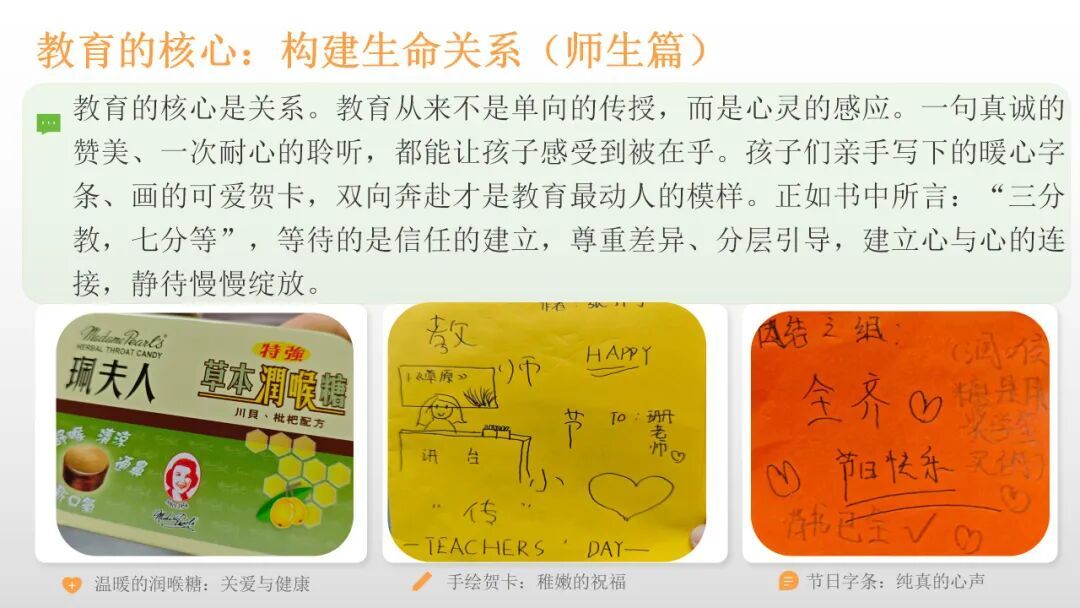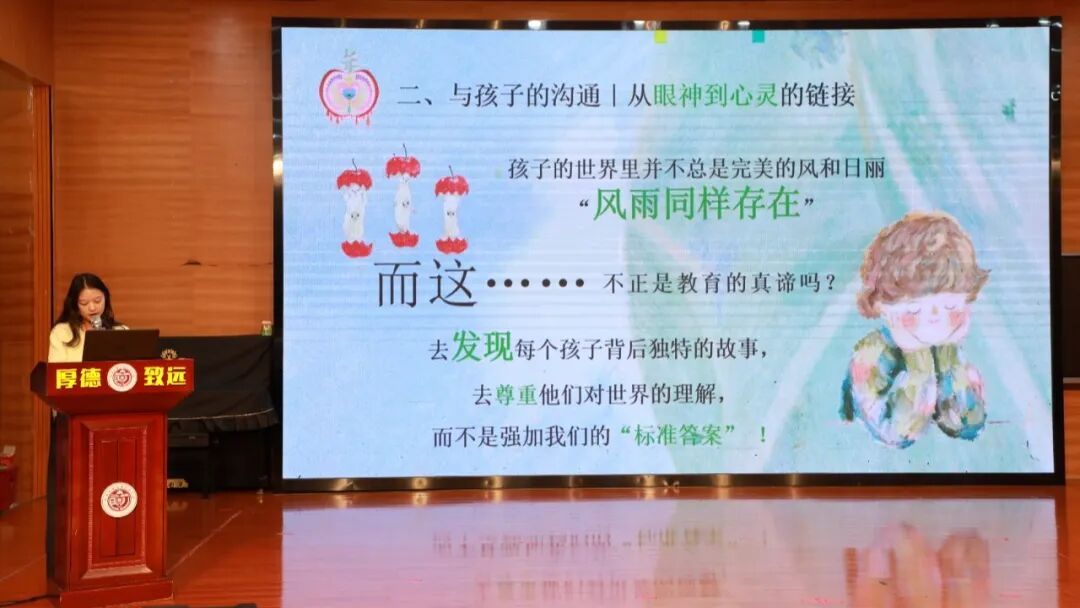 陈慧珊副校长以《教育的根本》为引,为我们带来深刻的教育思考。她指出教育的根本是心灵的安顿,要以善良与德行为基石,给孩子安全的探索空间;核心是构建平等的生命关系,以真诚与耐心实现师生双向奔赴;延伸则是家校协同,凝聚育人合力。同时,教育者更要躬身修炼,保持教育的温度与纯度,在浮躁中沉淀静气、扎根学习。教育本是慢的艺术,道阻且长,行则将至,唯有心怀教育初心,坚守育人根本,以爱浇灌、以静待之,方能唤醒孩子内心的美好,成全每一个独一无二的生命绽放。
