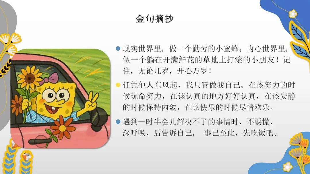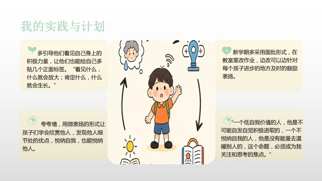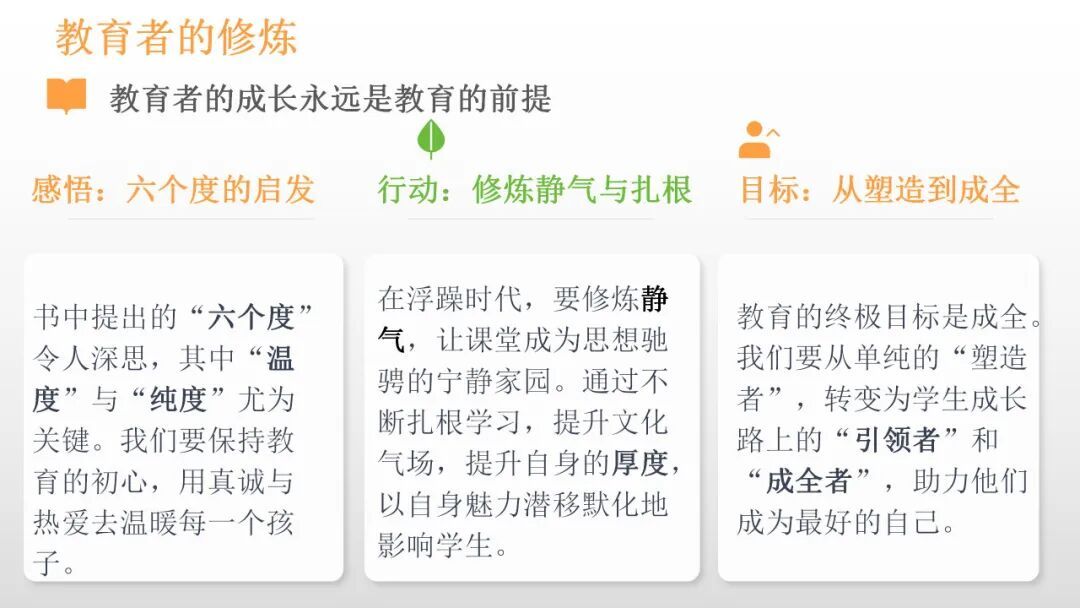 叶颖欣老师结合一年级的教学实践,分享了阅读《心平气和的一年级》后的感悟。叶老师从书中习得静纳百川、宽严相济、静待花开的育人智慧,明白教育需以静滋养孩子的专注力,以包容接纳孩子的试错,以耐心陪伴孩子慢慢成长;教育不必急于求成,放慢脚步,调整心态,方能让教育回归本真,在平和中守护孩子的成长,收获教育的美好。
