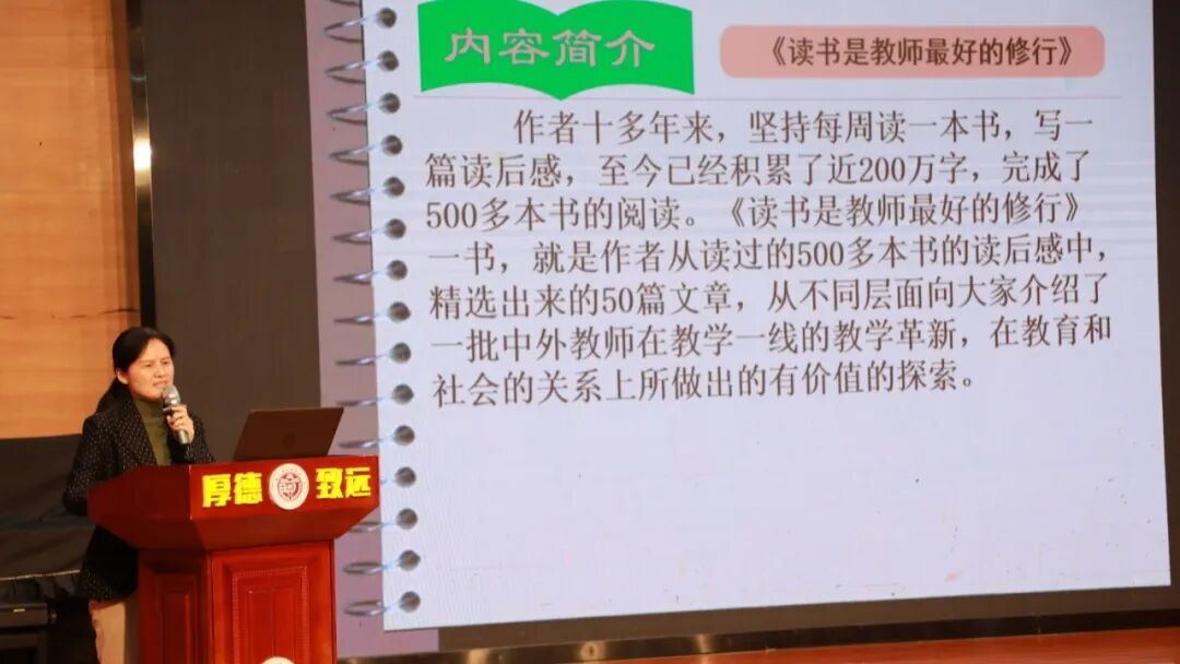 钟晓棠老师分享常生龙所著的《读书是教师最好的修行》,这本书以阶梯式思考呈现立足当下、聚焦未来的教育观,点明读书是教师自身发展、职业要求与推广阅读的必然要求。钟老师谈到教师要始终提升自身修养,将了解作为教育的前提,更要携手家长培养孩子的阅读习惯,以读书为修行,深耕教育之路。