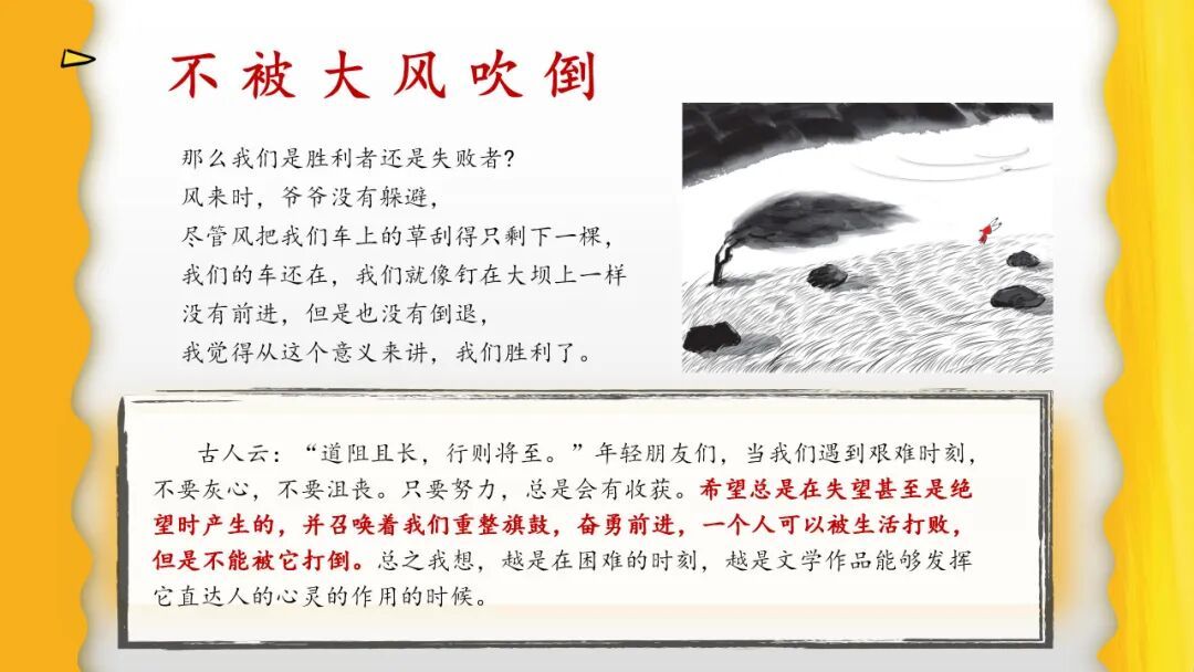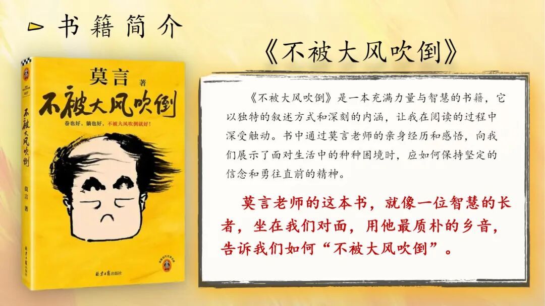 何奕汶老师分享莫言的《不被大风吹倒》,这本书以作者亲身经历传递直面困境的力量与智慧。何老师谈到书中传递的诸多人生真谛:人要拥有翻篇的能力,不纠缠过往;要接纳人生的不完美,懂得真正的强大是允许一切发生;更要在人生的风浪中扎根坚守,无论卷与躺,只要不被大风吹倒、不退却,便是胜利。