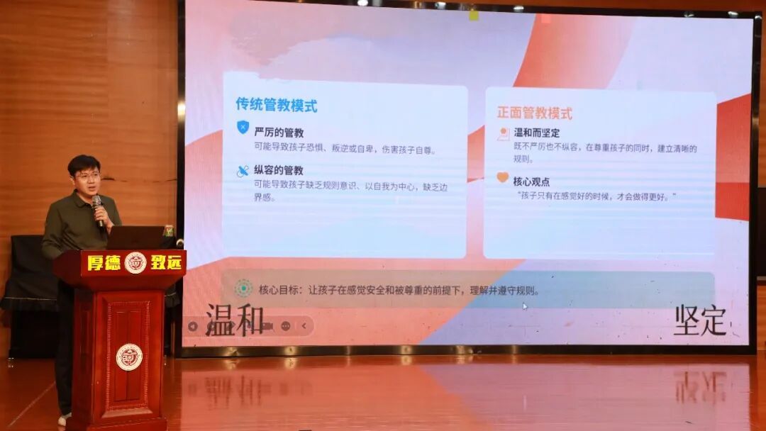 张盛副校长老师向大家分享的是《正面管教》。他介绍道书中关键方法是先连接情感再纠正行为,先处理心情再处理事情;核心原则为尊重与规则并行,既坚定守住行为底线,又温和尊重孩子感受。其最终目标是培养孩子的自律、责任感与解决问题的能力,以赋能替代控制,用情感连接筑牢教育基石,让孩子成长为内心强大、能为自己负责的人。