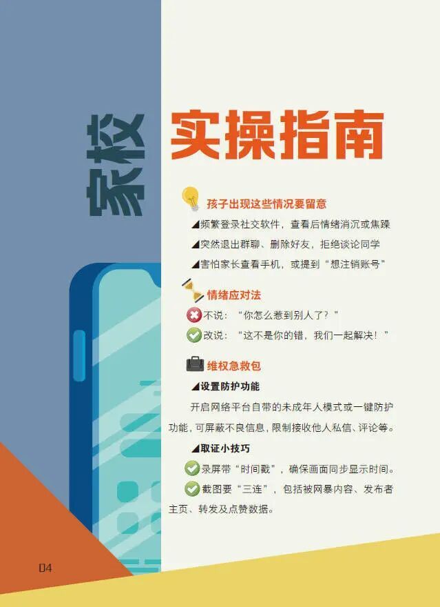青少年网络保护不仅是小朋友自己的功课,更是大朋友的责任。作为《 网络迷城闯关指南》的配套读本,《家校手册》为家长、老师提 供了“风险识别+维权指南+行动方案+教学指引”的全场景解决方案,可有效帮助成人理解孩子面临的数字困境,实现高质量陪伴与引导。