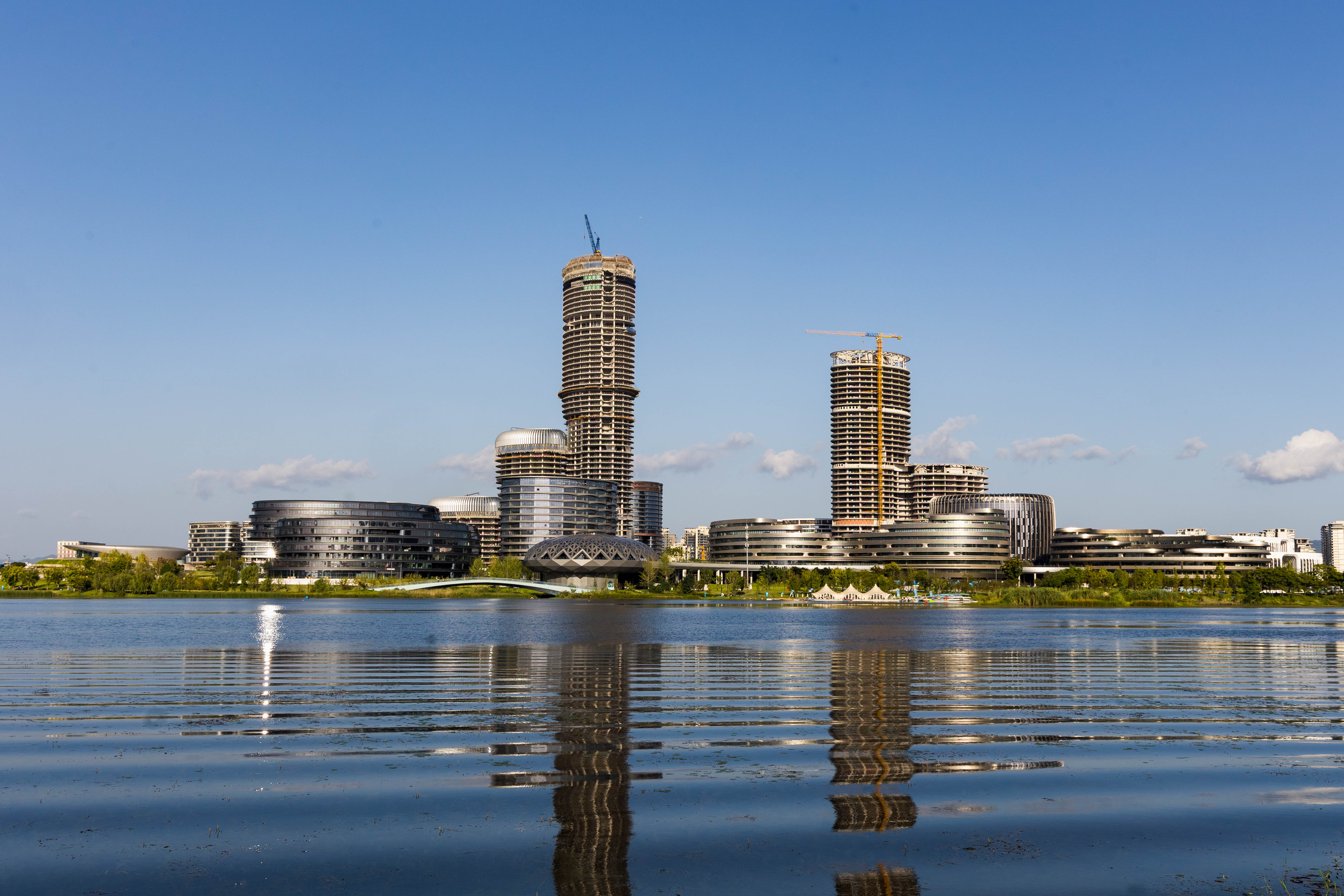 成都科创生态岛四面环水,占地面积约1006亩,分为创新转化服务区、新兴产业育成区和生态活力聚集区。岛上建筑错落分布、未来感十足。