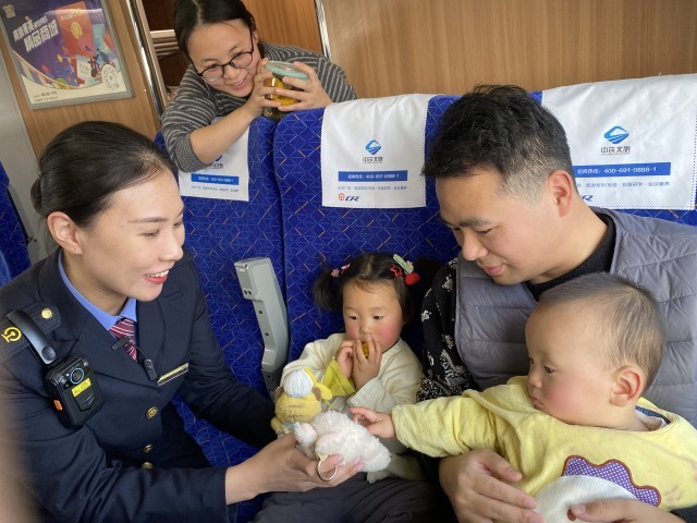 2月2日,由青岛到南昌西的G3367次列车上,乘务员张悦与一名小朋友乘客互动。当日是2026年春运首日,为期40天的春运大幕正式拉开,铁路工作者们在列车上各司其职,守护旅客平安、有序、温馨的回家路。翟祚珩/摄